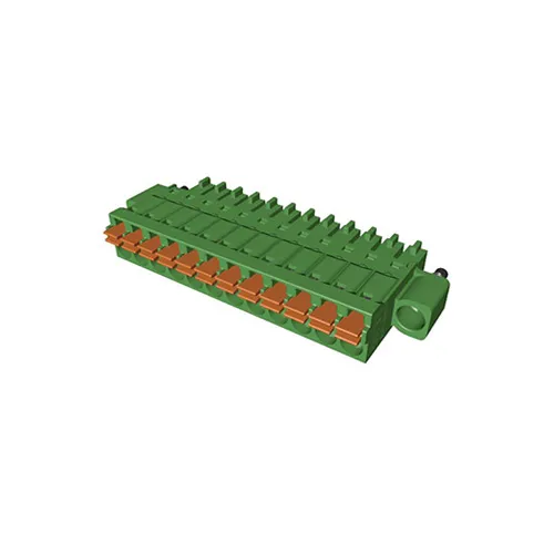 产品描述:矮型弹簧式插头,插拔式端子台-插头LKPGF350,间距3.50mm,位数02p~16p,绿端子,插拔方向平行于导线轴方向,带固定法兰